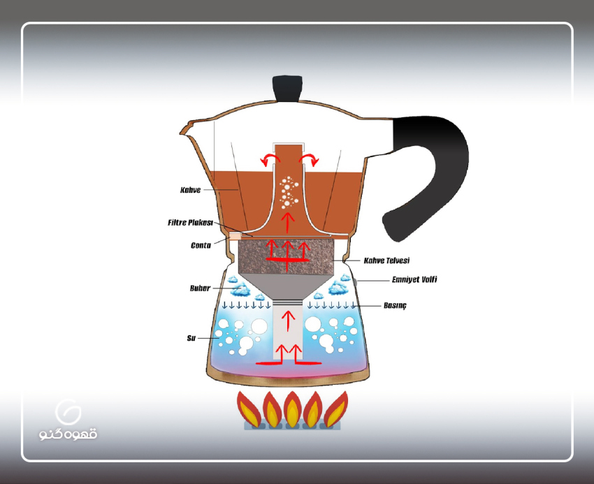 4. قرار دادن روی حرارت: موکاپات را روی شعله ملایم قرار دهید تا آب به جوش آمده و بر اثر فشار قهوه به قسمت بالایی منتقل شود.
